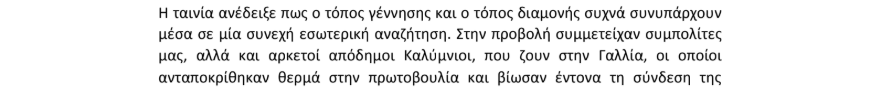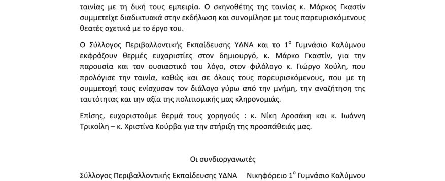 Η εκδήλωση, που συνδιοργανώθηκε από τον Σύλλογο Περιβαλλοντικής Εκπαίδευσης ΥΔΝΑ και το 1ο Γυμνάσιο Καλύμνου, ανέδειξε με συγκίνηση το θέμα της μετανάστευσης και της διπλής ταυτότητας, αγγίζοντας ιδιαίτερα την τοπική κοινωνία και τους απόδημους Καλύμνιους της Γαλλίας.