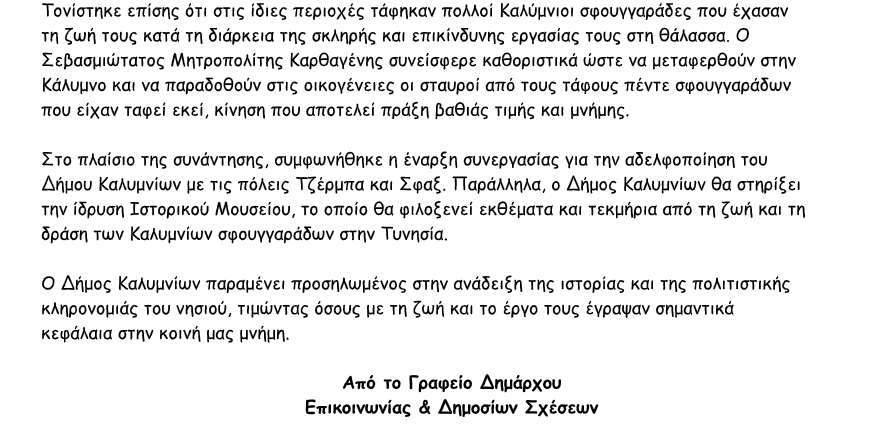 Συζητήθηκε η πλούσια κληρονομιά των Καλυμνίων σφουγγαράδων στην Τυνησία, η απόδοση τιμής στους θαλασσομάχους που έχασαν τη ζωή τους, καθώς και η δρομολόγηση ενεργειών για την αδελφοποίηση με τις πόλεις Τζέρμπα και Σφαξ και την ίδρυση Ιστορικού Μουσείου.