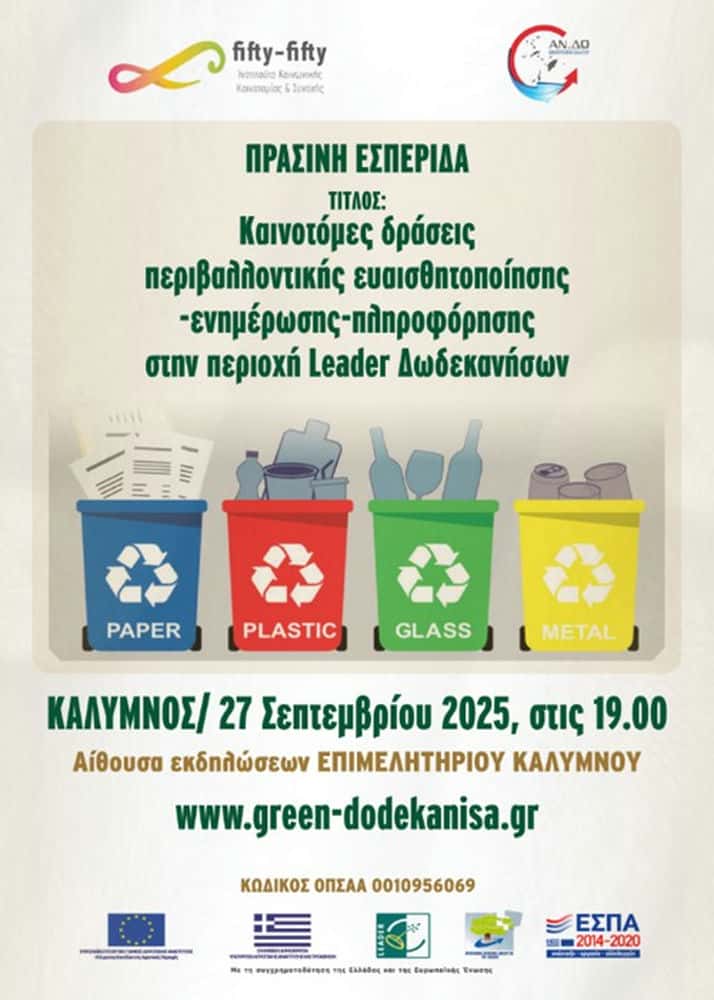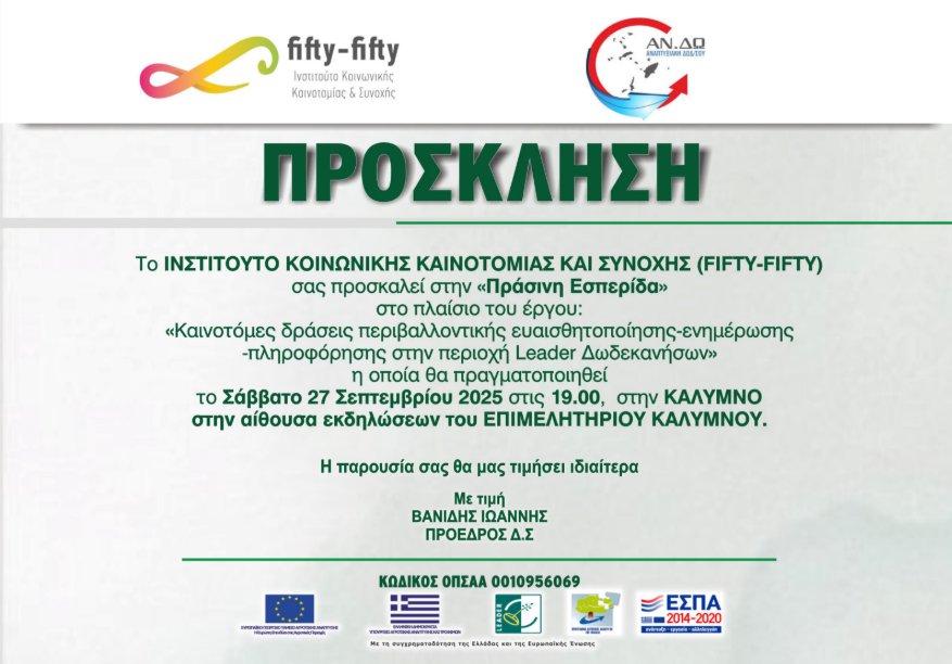 Το Ινστιτούτο Κοινωνικής Καινοτομίας και Συνοχής (fifty-fifty) διοργανώνει το Σάββατο 27 Σεπτεμβρίου 2025, στις 19:00, στην αίθουσα εκδηλώσεων του Επιμελητηρίου Καλύμνου, την “Πράσινη Εσπερίδα” στο πλαίσιο του έργου «Καινοτόμες δράσεις περιβαλλοντικής ευαισθητοποίησης – ενημέρωσης – πληροφόρησης στην περιοχή Leader Δωδεκανήσων».