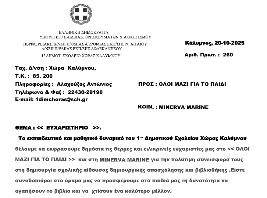 Ένα μεγάλο “ευχαριστώ” από το 1ο Δημοτικό Σχολείο Χώρας Καλύμνου στη ναυτιλιακή εταιρεία MINERVA MARINE & στο “Όλοι Μαζί για το Παιδί”