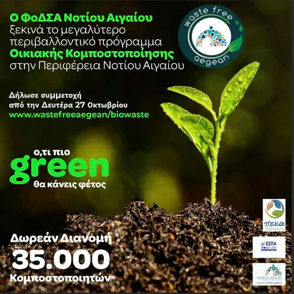 Ο ΦοΔΣΑ Νοτίου Αιγαίου ξεκινά το μεγαλύτερο περιβαλλοντικό πρόγραμμα Οικιακής Κομποστοποίησης στην Περιφέρεια Νοτίου Αιγαίου με τη δωρεάν διανομή 35.000 κομποστοποιητών σε νοικοκυριά.