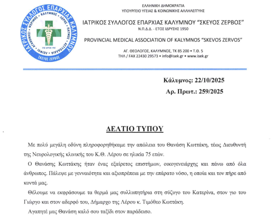 Με βαθιά θλίψη ο Ιατρικός Σύλλογος Επαρχίας Καλύμνου εκφράζει τα συλλυπητήριά του για την απώλεια του Θανάση Κωττάκη, πρώην Διευθυντή της Νευρολογικής Κλινικής του Κ.Θ. Λέρου. Ο εκλιπών υπήρξε ένας διακεκριμένος επιστήμονας, αγαπητός συνάδελφος και άνθρωπος με ήθος και αξιοπρέπεια, που έδωσε με γενναιότητα τη μάχη του με την ασθένεια. Ο Σύλλογος εκφράζει τη συμπαράστασή του στην οικογένειά του και εύχεται αιώνια η μνήμη του.