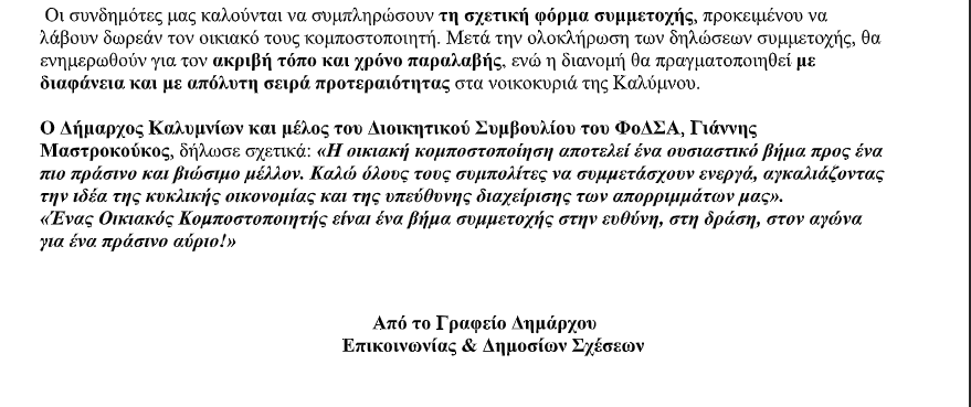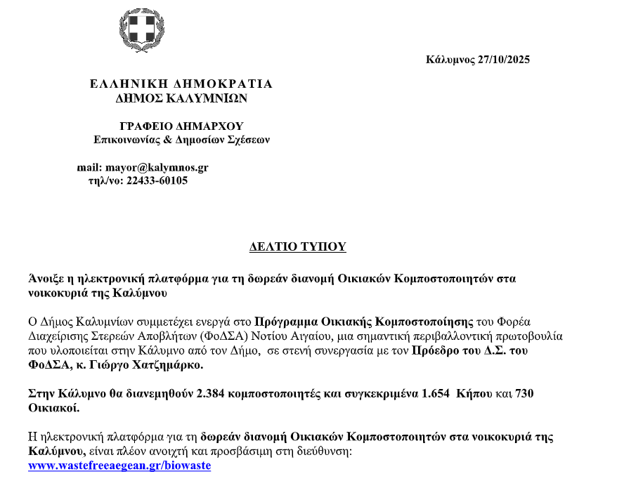 Ο Δήμος Καλυμνίων ανακοινώνει την έναρξη λειτουργίας της ηλεκτρονικής πλατφόρμας για τη δωρεάν διάθεση οικιακών κομποστοποιητών στους κατοίκους του νησιού, στο πλαίσιο του Προγράμματος Οικιακής Κομποστοποίησης του ΦοΔΣΑ Νοτίου Αιγαίου. Μέσα από αυτή τη σημαντική περιβαλλοντική πρωτοβουλία, η Κάλυμνος κάνει ένα ουσιαστικό βήμα προς την πράσινη ανάπτυξη και την υπεύθυνη διαχείριση των απορριμμάτων, ενθαρρύνοντας τους δημότες να συμμετάσχουν ενεργά στη δημιουργία ενός πιο βιώσιμου μέλλοντος.