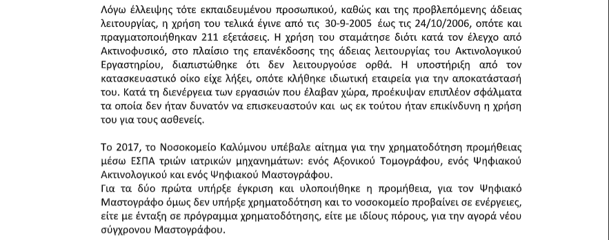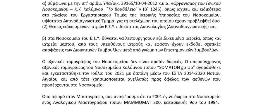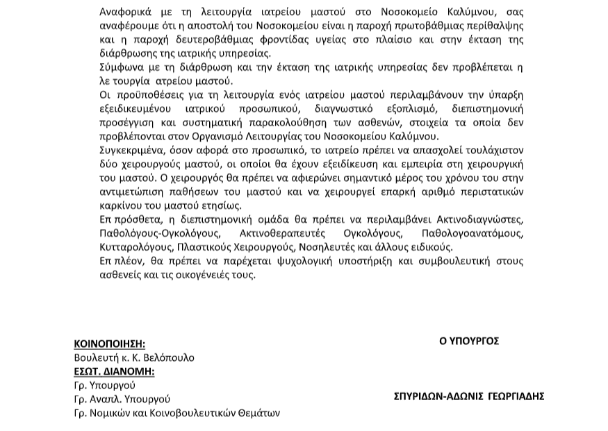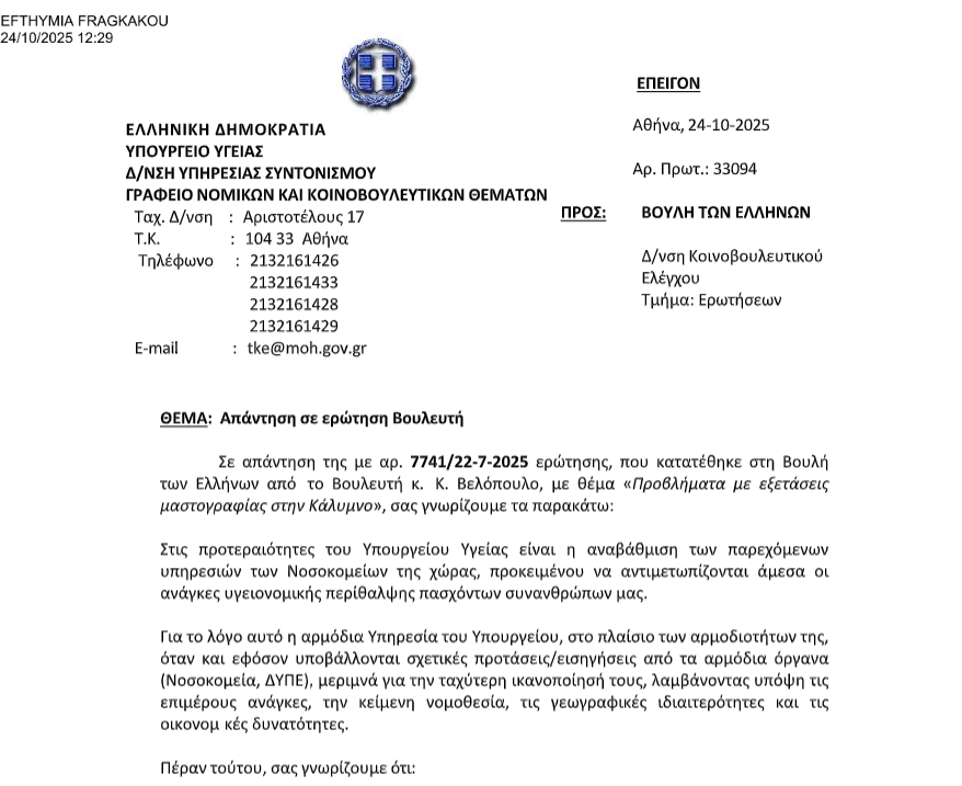 Ο Πρόεδρος της Ελληνικής Λύσης, Κυριάκος Βελόπουλος, κατέθεσε στη Βουλή ερώτηση σχετικά με τα σοβαρά προβλήματα που αντιμετωπίζουν οι γυναίκες της Καλύμνου στις εξετάσεις μαστογραφίας, λόγω έλλειψης κατάλληλου εξοπλισμού και υποδομών. Στις 24 Οκτωβρίου 2025, ο Υπουργός Υγείας Άδωνις Γεωργιάδης απάντησε επίσημα, διευκρινίζοντας την υφιστάμενη κατάσταση στο Νοσοκομείο Καλύμνου «Το Βουβάλειο» και αναφέροντας ότι το Υπουργείο καταβάλλει προσπάθειες για την προμήθεια νέου ψηφιακού μαστογράφου, καθώς και για τη συνολική αναβάθμιση των παρεχόμενων υπηρεσιών υγείας στο νησί.