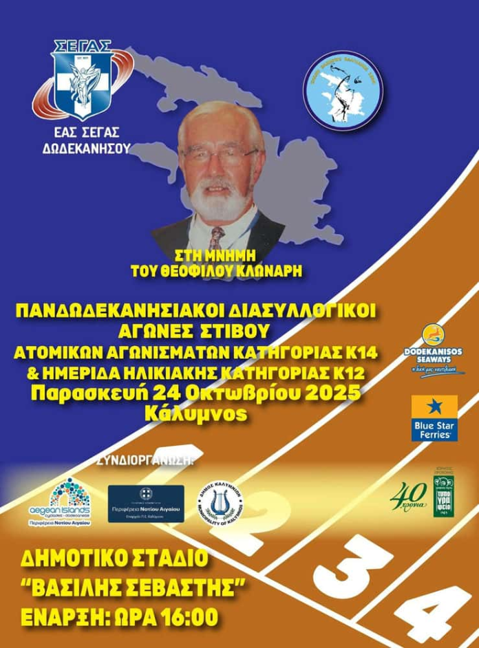 Η Κάλυμνος θα αποτελέσει το επίκεντρο του δωδεκανησιακού στίβου αύριο Παρασκευή 24 Οκτωβρίου 2025, καθώς στο Δημοτικό Στάδιο του Αθλητικού Κέντρου Καλύμνου «Βασίλης Σεβαστής» θα διεξαχθούν οι Πανδωδεκανησιακοί Διασυλλογικοί Αγώνες Στίβου Ατομικών Αγωνισμάτων κατηγορίας Κ14 και η Ημερίδα κατηγορίας Κ12, στη μνήμη του αείμνηστου Θεόφιλου Κλωνάρη.