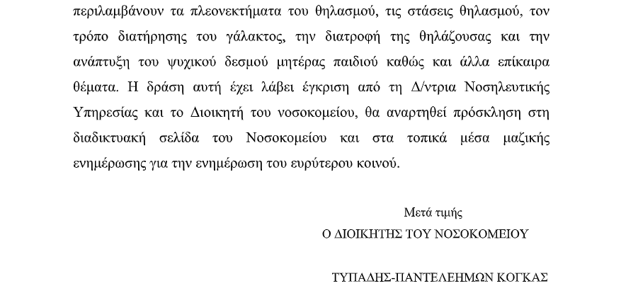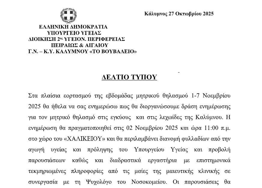 Το Γενικό Νοσοκομείο – Κέντρο Υγείας Καλύμνου «Το Βουβάλειο» συμμετέχει στον εορτασμό της Εβδομάδας Μητρικού Θηλασμού (1–7 Νοεμβρίου 2025) με μια ολοκληρωμένη δράση ενημέρωσης για εγκύους και λεχωίδες του νησιού. Η εκδήλωση θα πραγματοποιηθεί την Κυριακή 2 Νοεμβρίου 2025, στις 11:00 π.μ., στον χώρο του «Χαλικείου», και θα περιλαμβάνει παρουσιάσεις, διαδραστικά εργαστήρια και διανομή ενημερωτικού υλικού σχετικά με τα οφέλη και τις πρακτικές του μητρικού θηλασμού. Τη δράση θα υλοποιήσουν οι μαίες της Μαιευτικής Κλινικής σε συνεργασία με την Ψυχολόγο του Νοσοκομείου, με στόχο την ενίσχυση της γνώσης και της εμπιστοσύνης των νέων μητέρων απέναντι στον θηλασμό.