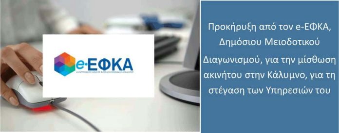 Ο Ηλεκτρονικός Εθνικός Φορέας Κοινωνικής Ασφάλισης (e-ΕΦΚΑ) προκηρύσσει Δημόσιο Επαναληπτικό Μειοδοτικό Διαγωνισμό για τη μίσθωση ακινήτου στην Κάλυμνο, προκειμένου να καλύψει τις στεγαστικές ανάγκες της Τοπικής Διεύθυνσης Β΄ Δωδεκανήσου.