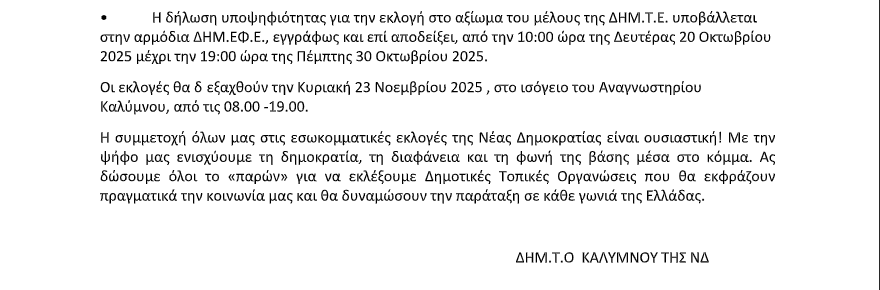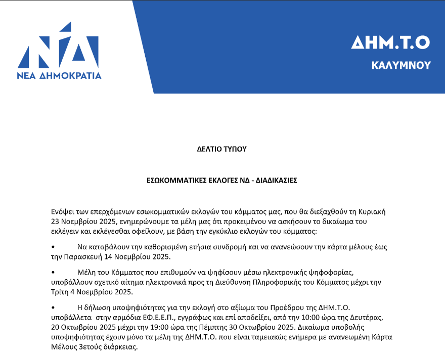 Η ΔΗΜ.Τ.Ο. Καλύμνου της Νέας Δημοκρατίας ενημερώνει τα μέλη της για τις διαδικασίες και τις σημαντικές ημερομηνίες που αφορούν τις επερχόμενες εσωκομματικές εκλογές, οι οποίες θα πραγματοποιηθούν την Κυριακή 23 Νοεμβρίου 2025 στο Αναγνωστήριο Καλύμνου. Η συμμετοχή των μελών θεωρείται καθοριστικής σημασίας για την ενίσχυση της δημοκρατίας, της διαφάνειας και της ενεργούς παρουσίας της βάσης μέσα στο κόμμα.