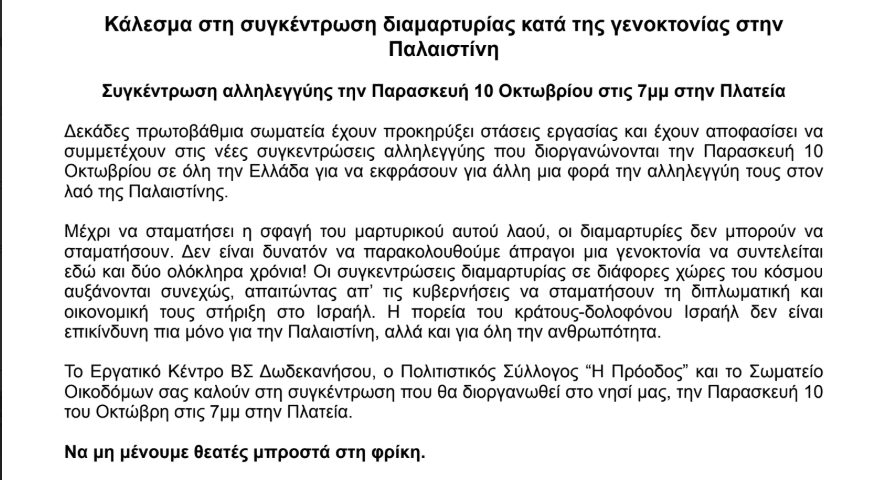 Το Εργατικό Κέντρο ΒΣ Δωδεκανήσου, ο Πολιτιστικός Σύλλογος «Η Πρόοδος» και το Σωματείο Οικοδόμων καλούν τους κατοίκους της Καλύμνου να συμμετάσχουν στη συγκέντρωση αλληλεγγύης προς τον παλαιστινιακό λαό, την Παρασκευή 10 Οκτωβρίου στις 7 μ.μ. στην κεντρική Πλατεία Καλύμνου. Η κινητοποίηση πραγματοποιείται στο πλαίσιο πανελλαδικών δράσεων διαμαρτυρίας, με τη συμμετοχή δεκάδων σωματείων που απαιτούν τον τερματισμό της αιματηρής επίθεσης και εκφράζουν την αλληλεγγύη τους στον δοκιμαζόμενο λαό της Παλαιστίνη
