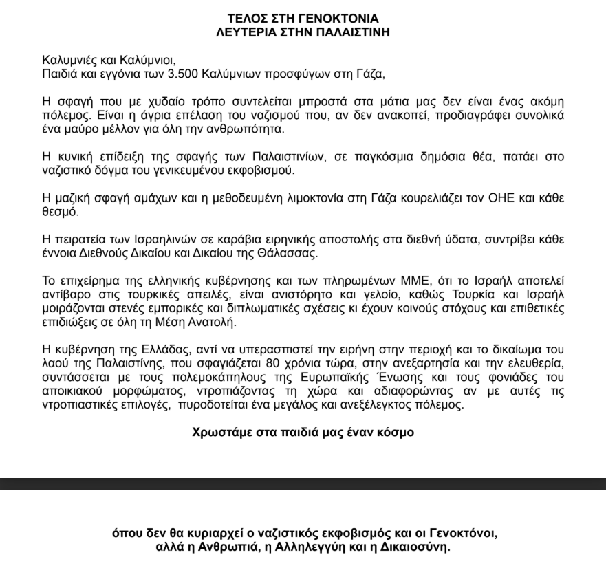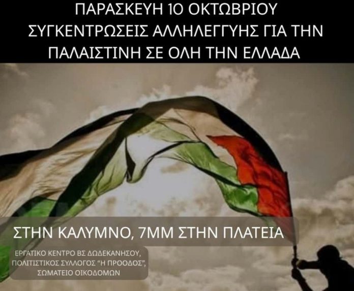 Κάλεσμα για συγκέντρωση αλληλεγγύης προς τον παλαιστινιακό λαό, στην Κάλυμνο την Παρασκευή 10/10