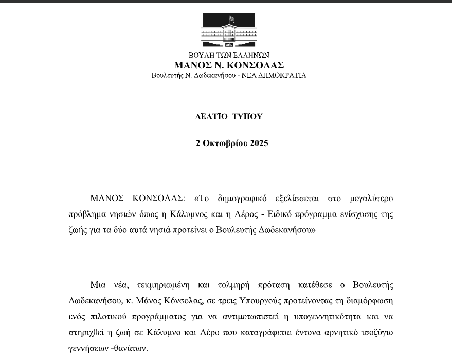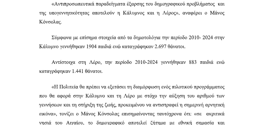 Την ανάγκη άμεσης παρέμβασης της Πολιτείας για την αντιστροφή της δραματικής δημογραφικής εικόνας στην Κάλυμνο και τη Λέρο ανέδειξε ο Βουλευτής Δωδεκανήσου, Μάνος Κόνσολας.
