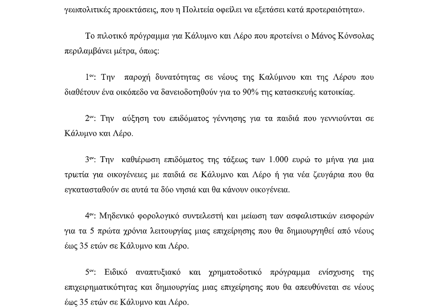 Μάνος Κόνσολας : ” Πιλοτικό πρόγραμμα για την αντιμετώπιση του δημογραφικού στην Κάλυμνο και τη Λέρο”