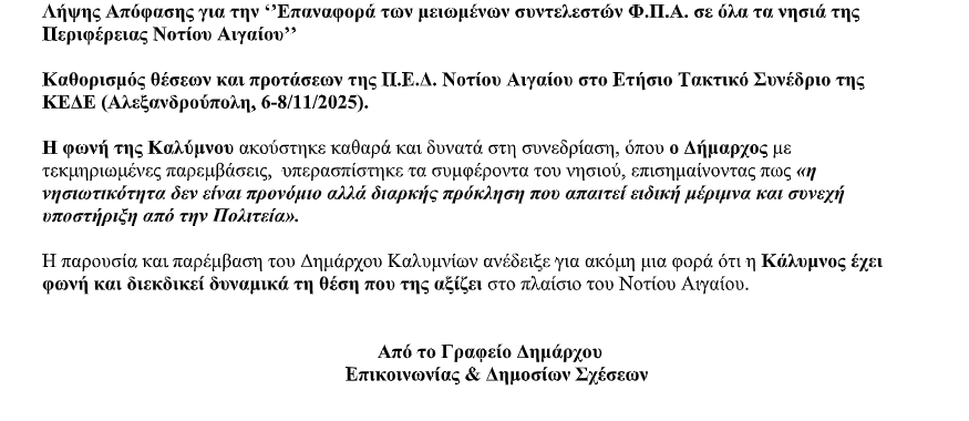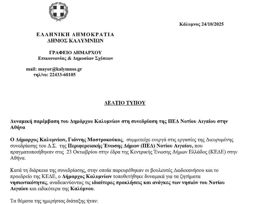 Με ουσιαστικές παρεμβάσεις και τεκμηριωμένες θέσεις για τα ζητήματα νησιωτικότητας, ο Δήμαρχος Καλυμνίων, Γιάννης Μαστροκούκος, συμμετείχε ενεργά στη διευρυμένη συνεδρίαση του Δ.Σ. της ΠΕΔ Νοτίου Αιγαίου, που πραγματοποιήθηκε στις 23 Οκτωβρίου στην Αθήνα, διεκδικώντας δυναμικά τα συμφέροντα της Καλύμνου και των νησιών του Νοτίου Αιγαίου.