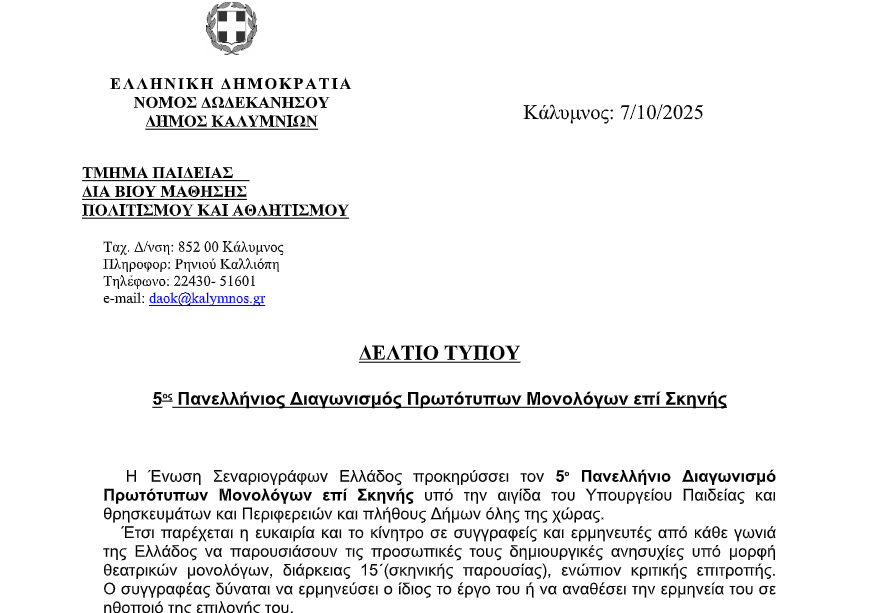 Ο Δήμος Καλυμνίων συμμετέχει ενεργά στον 5ο Πανελλήνιο Διαγωνισμό Πρωτότυπων Μονολόγων επί Σκηνής