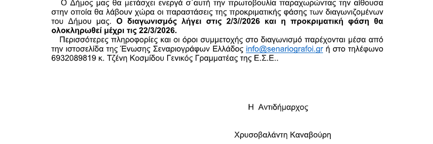 Ο Δήμος Καλυμνίων συμμετέχει ενεργά στη σημαντική αυτή πρωτοβουλία, φιλοξενώντας τις παραστάσεις της προκριματικής φάσης, που θα ολοκληρωθεί έως τις 22 Μαρτίου 2026. Ο διαγωνισμός αποτελεί μια ανοιχτή πρόσκληση σε όλους όσοι αγαπούν το θέατρο και την καλλιτεχνική δημιουργία να μοιραστούν τη δική τους φωνή επί σκηνής