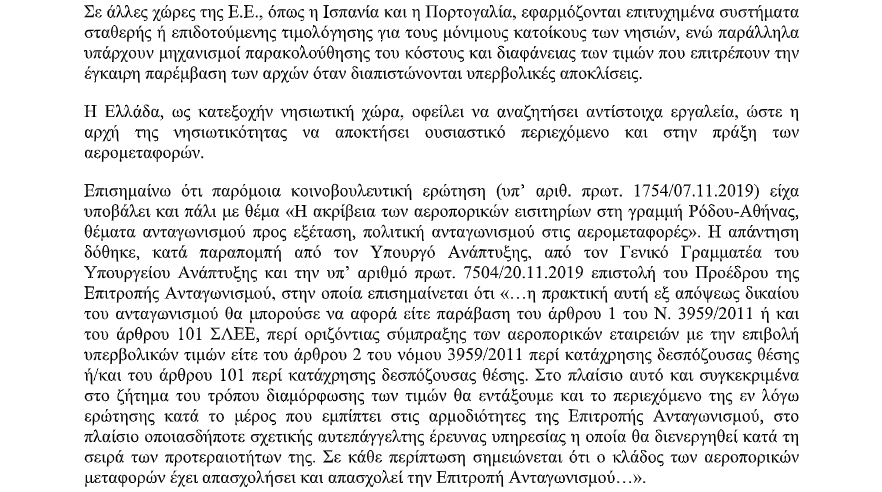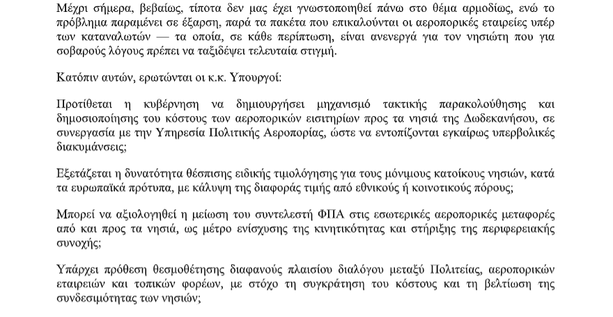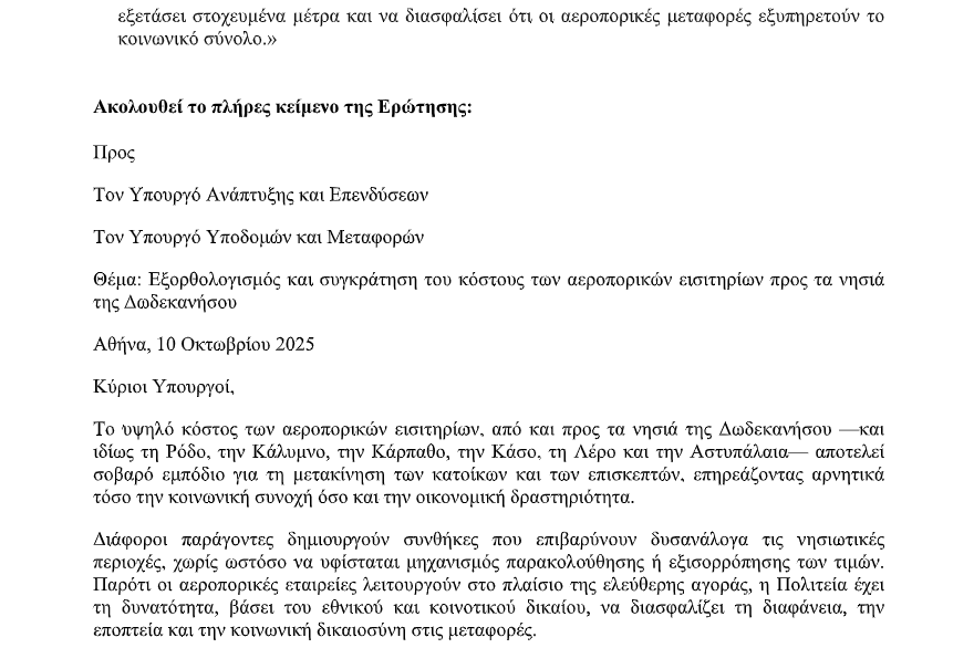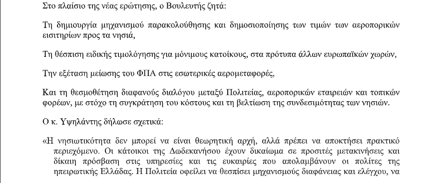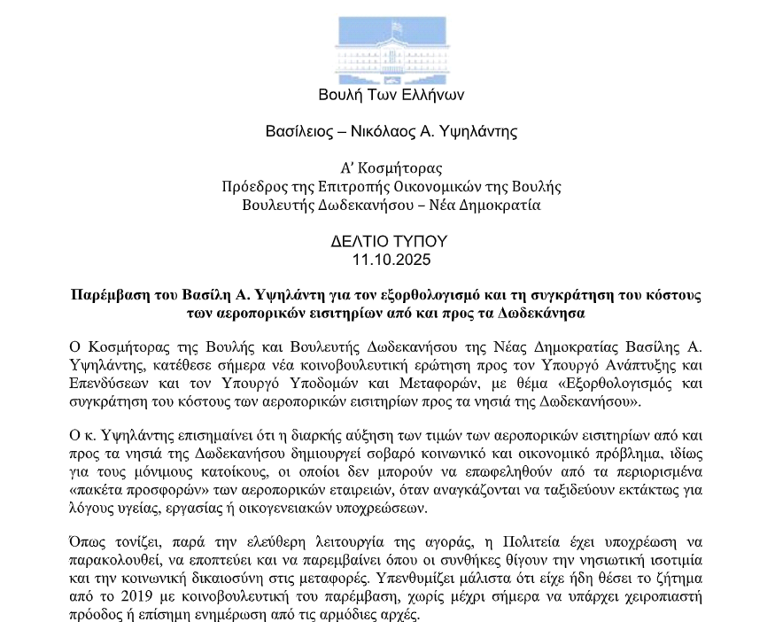 Παρέμβαση Βασίλη Α. Υψηλάντη για τη συγκράτηση του κόστους των αεροπορικών εισιτηρίων προς τα Δωδεκάνησα