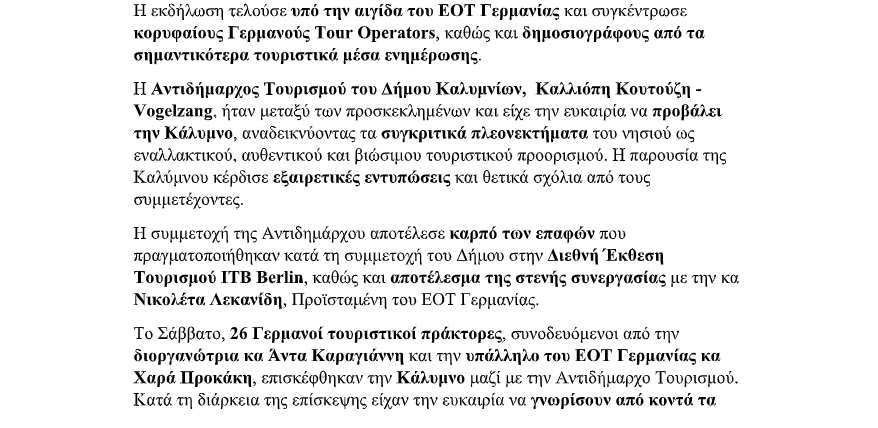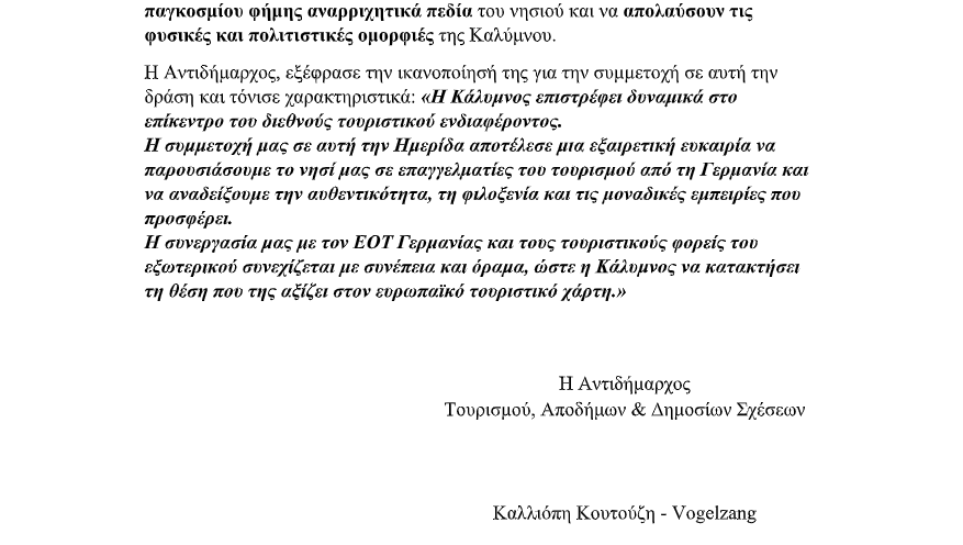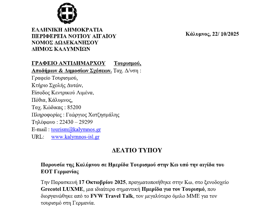 Από το Γραφείο Αντιδημάρχου Τουρισμού, Αποδήμων & Δημοσίων Σχέσεων Καλλιόπης Κουτούζη – Vogelzang εκδόθηκε το παρακάτω δελτίο τύπου για την παρουσία της Καλύμνου σε Ημερίδα Τουρισμού στην Κω υπό την αιγίδα του ΕΟΤ Γερμανίας και την επίσκεψη 26 Γερμανών τουριστικών πρακτόρων στο νησί της Καλύμνου το Σάββατο 19 Οκτωβρίου 2025.