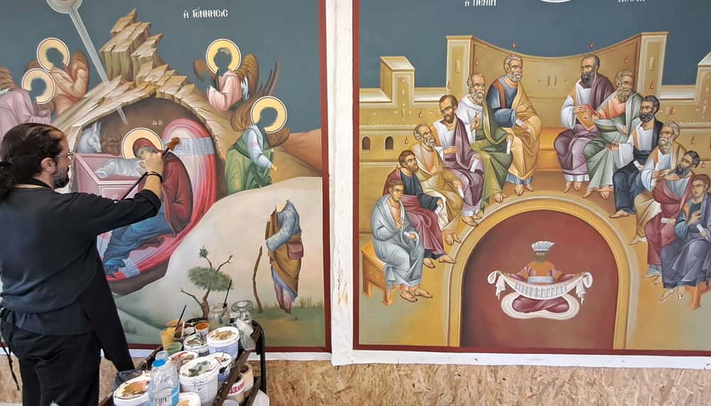 Η αγιογραφία της Πεντηκοστής, την οποία είχε παρουσιάσει παλαιότερα και το Kalymnos News, βρίσκεται επίσης στο τελικό στάδιο. Όπως μας ενημέρωσε, μεγάλο μέρος της φιλοτεχνήθηκε από τη Χρύσα Αβραμίδη, συνεργάτιδα και μαθήτριά του, η οποία διατηρεί δικό της εργαστήριο ζωγραφικής στις Πατήθριες.