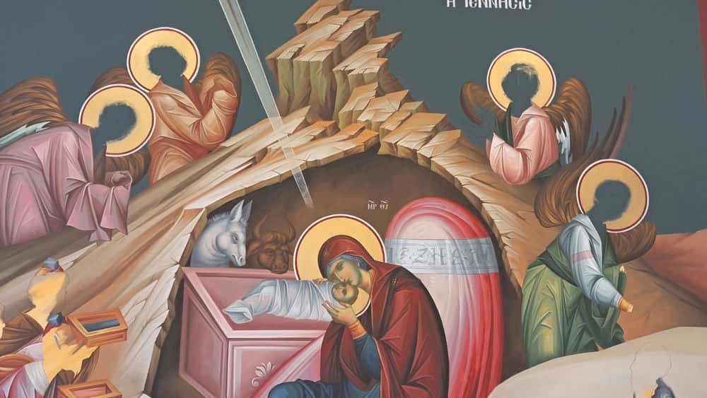 «Η βυζαντινή Γέννηση διαφέρει από την αναγεννησιακή, που είναι πιο ρομαντική. Εδώ η σπηλιά είναι σκοτεινή, δείχνοντας το σκότος της κοινωνίας μπροστά στο φως του Χριστού. Το βρέφος είναι σπαργανωμένο, όπως τύλιγαν τότε τους νεκρούς, δείχνοντας την πορεία που θα έχει. Δεν έχουμε φάτνη, αλλά τάφο — συμβολισμό της θυσίας. Το πρόσωπο του μωρού είναι ώριμο, δείχνοντας τη σοφία. Η Παναγία εικονίζεται καθιστή, γιατί ο τοκετός της ήταν ανώδυνος».