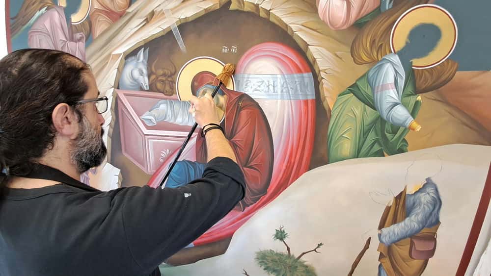 Στο εργαστήριο, ο φακός μας κατέγραψε μια εντυπωσιακή αγιογραφία της Γέννησης του Χριστού, έργο σε εξέλιξη, που προορίζεται για ναό στη Νέα Υόρκη. Ο Αντώνης Καμπουράκης μας εξήγησε με σεμνότητα αλλά και βαθιά γνώση τη θεολογική ερμηνεία κάθε στοιχείου της εικόνας:
