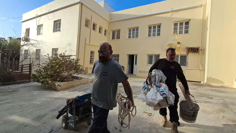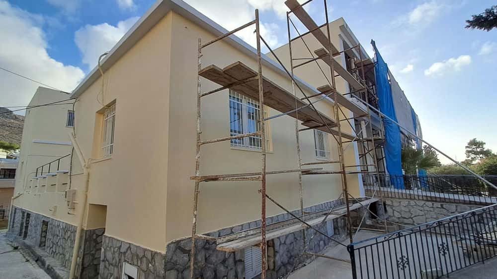 Ο Μιχάλης Σκανδαλιάρης, με την έμπειρη ομάδα του, ανέλαβε όλες τις οικοδομικές εργασίες, οι οποίες ολοκληρώθηκαν μέσα σε μόλις 2,5 μήνες. Το έργο περιλάμβανε καθαιρέσεις φθαρμένων σοβάδων, αποκατάσταση ζημιών σε κολώνες και εκτεταμένες επισκευές στα εξωτερικά τμήματα του μεγάλου κτιρίου.