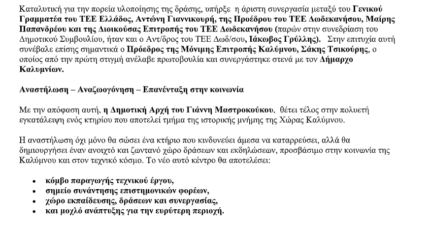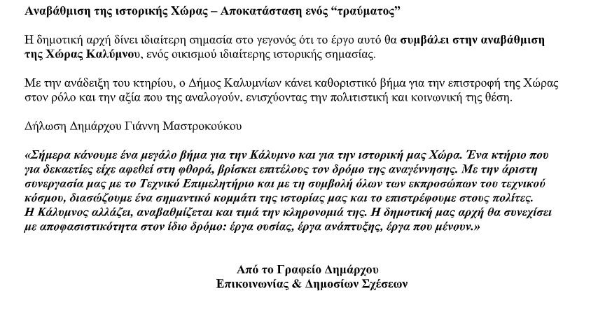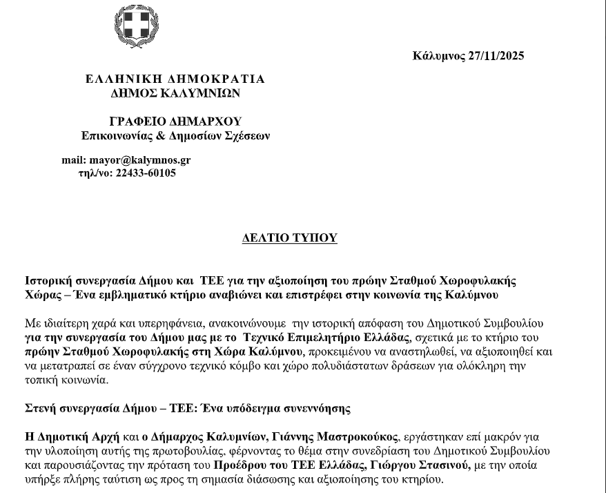 Ο Δήμος Καλυμνίων ανακοινώνει με ιδιαίτερη χαρά την έγκριση της συνεργασίας με το Τεχνικό Επιμελητήριο Ελλάδας για την αναστήλωση και αξιοποίηση του πρώην Σταθμού Χωροφυλακής στη Χώρα Καλύμνου. Πρόκειται για μια ιστορική πρωτοβουλία που θέτει τέλος στην εγκατάλειψη ενός εμβληματικού κτηρίου και ανοίγει τον δρόμο για τη μετατροπή του σε έναν σύγχρονο τεχνικό κόμβο, χώρο δράσεων, εκπαίδευσης και συνεργασίας, επιστρέφοντάς το δυναμικά στην κοινωνία και την ιστορική ταυτότητα της περιοχής.