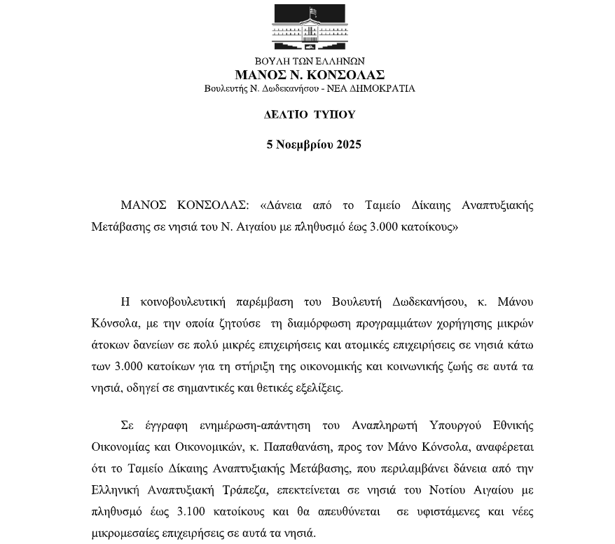 Σημαντική εξέλιξη για τα μικρά νησιά του Νοτίου Αιγαίου αποτελεί η αποδοχή της πρότασης του Βουλευτή Δωδεκανήσου, Μάνου Κόνσολα, για τη χορήγηση άτοκων και χαμηλότοκων δανείων σε πολύ μικρές και ατομικές επιχειρήσεις σε νησιά με πληθυσμό έως 3.000 κατοίκους. Όπως προκύπτει από την απάντηση του Αναπληρωτή Υπουργού Εθνικής Οικονομίας και Οικονομικών, κ. Παπαθανάση, το Ταμείο Δίκαιης Αναπτυξιακής Μετάβασης επεκτείνεται στα νησιά αυτά, ενισχύοντας τις τοπικές οικονομίες, την απασχόληση και τη βιώσιμη ανάπτυξη, με στόχο την παραμονή των κατοίκων, ιδιαίτερα των νέων, στον τόπο τους.