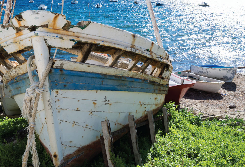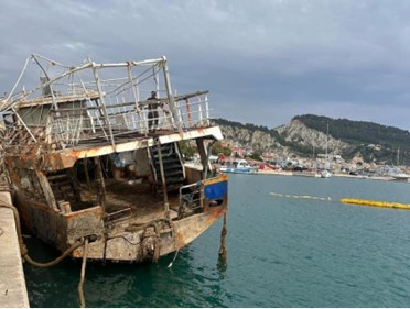 Πλεούμενο δεμένο πλώρα με «κάλους» – κάβους, χοντρά καραβίσια παλαμάρια  και  στην πρύμνη με  πρυμάτσες – «πείσματα». «Κολλημένο» στο μουράγιο, εγκαταλειμμένο, κατεστραμμένο – λεηλατημένο, με τις λαμαρίνες του να  στάζουν  σκουριά, γέρνει έτοιμο, κουφάρι άδειο να βουλιάξει στο λιμάνι, που μαζί μ’ άλλα πλεούμενα το καταντούν νεκροταφείο πλοίων φαντασμάτων!