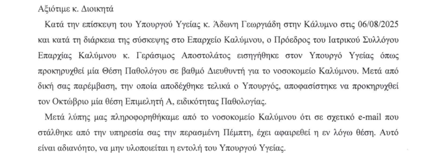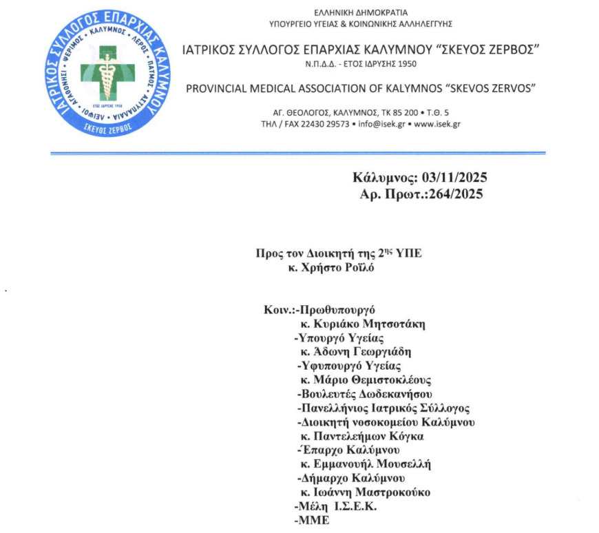 Με επιστολή του προς τον Διοικητή της 2ης ΥΠΕ κ. Χρήστο Ροϊλό, ο Ιατρικός Σύλλογος Επαρχίας Καλύμνου εκφράζει την έντονη δυσαρέσκειά του για την αφαίρεση της θέσης Παθολόγου Επιμελητή Α από τις νέες προκηρύξεις του Νοσοκομείου Καλύμνου, παρά τη ρητή απόφαση του Υπουργού Υγείας κ. Άδωνη Γεωργιάδη. Παράλληλα, ζητά την άμεση προκήρυξη θέσεων Διευθυντή Καρδιολογίας και Πνευμονολόγου–Φυματιολόγου, τονίζοντας ότι οι ελλείψεις σε βασικές ιατρικές ειδικότητες θέτουν σε κίνδυνο την εύρυθμη λειτουργία του νοσοκομείου και την υγειονομική κάλυψη των νησιωτών.