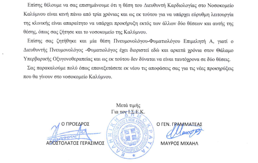 Διαμαρτυρία του Ι.Σ.Ε.Κ. προς τη 2η ΥΠΕ σχετικά με την προκήρυξη θέσεων ιατρών στο νοσοκομείο Καλύμνου