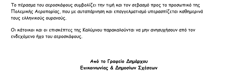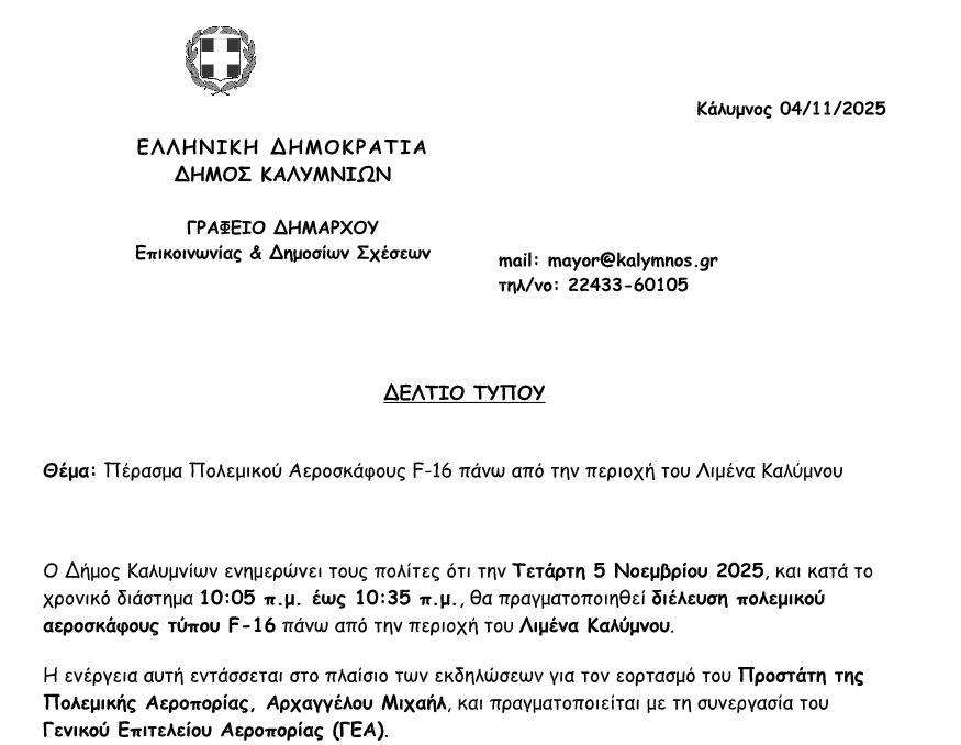 Μεταξύ των νησιών πάνω από τα οποία θα πετάξουν πολεμικά αεροσκάφη είναι και η Κάλυμνος και από το Δήμο Καλυμνίων εκδόθηκε το παρακάτω δελτίο τύπου: