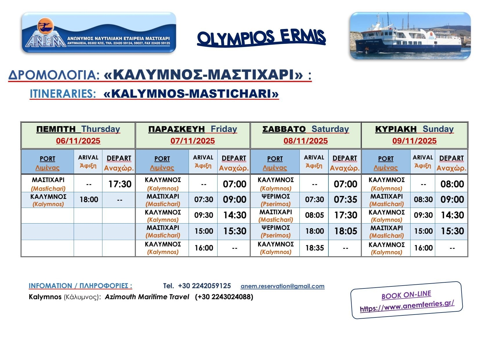 Όπως γνωστοποίησε η ΑΝΕ Μαστιχαρίου, στο χρονικό διάστημα από Πέμπτη 6 Νοεμβρίου έως και Κυριακή 9 Νοεμβρίου 2025, το επιβατηγό – οχηματαγωγό πλοίο «Ολύμπιος Ερμής» θα εκτελέσει δρομολόγια στη γραμμή Κάλυμνος – Μαστιχάρι, προκειμένου να εξυπηρετηθεί το επιβατικό κοινό και η μεταφορά οχημάτων.