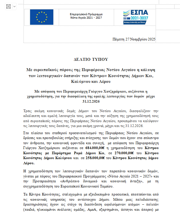Με αυξημένη χρηματοδότηση από το Περιφερειακό Πρόγραμμα «Νότιο Αιγαίο 2021–2027» εξασφαλίζεται η ομαλή λειτουργία των Κέντρων Κοινότητας σε Κω, Κάλυμνο και Λέρο έως το τέλος του 2026. Με απόφαση του Περιφερειάρχη Νοτίου Αιγαίου, Γιώργου Χατζημάρκου, ενισχύονται οικονομικά τρεις ακόμη κρίσιμες κοινωνικές δομές, με στόχο τη συνέχιση των υπηρεσιών στήριξης ευάλωτων πολιτών και την ενδυνάμωση της κοινωνικής συνοχής στα νησιά.