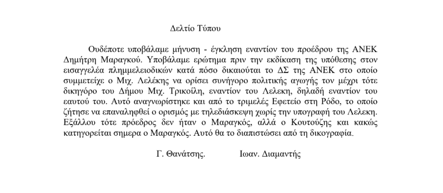 Όπως αναφέρουν οι Θανάτσης- Διαμαντής στο κοινό δελτίο, ουδέποτε υπέβαλαν μήνυση-έγκληση εναντίον του Δημήτρη Μαραγκού Υπέβαλαν όπως σημειώνουν ΕΡΩΤΗΜΑ πριν την εκδίκαση της υπόθεσης στον εισαγγελέα πλημμελειοδικών κατά πόσο δικαιούται το ΔΣ της ΑΝΕΚ στο οποίο συμμετείχε ο Μιχ. Λελέκης να ορίσει συνήγορο πολιτικής αγωγής τον μέχρι τότε δικηγόρο του Δήμου Μιχ. Τρικοίλη, εναντίον του Λελεκη, δηλαδή εναντίον του εαυτού του.