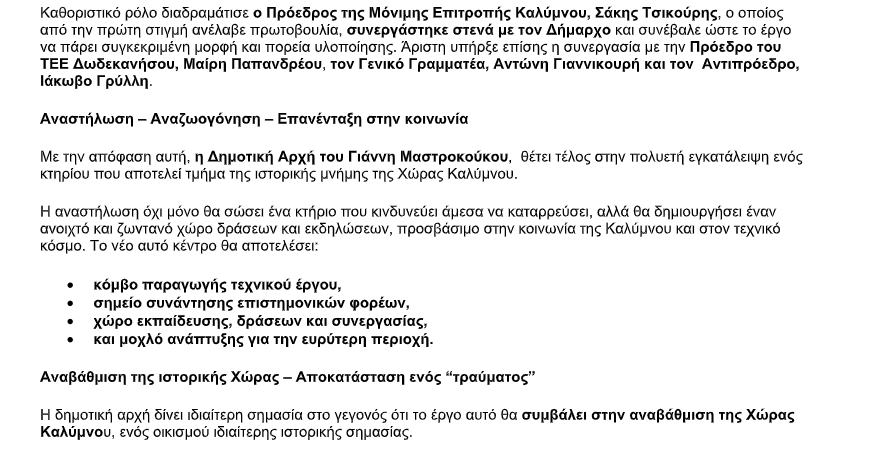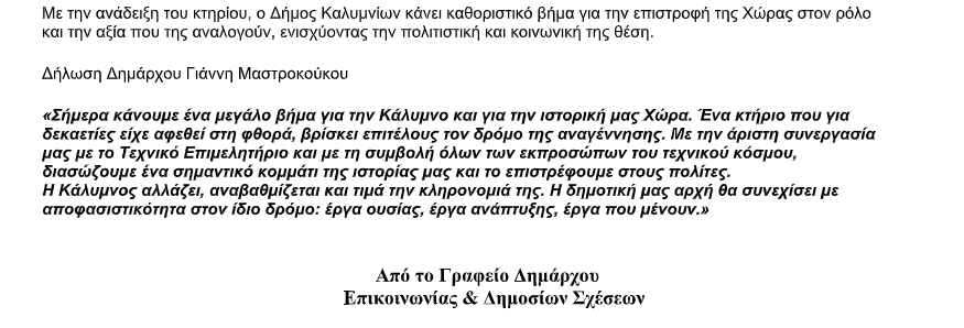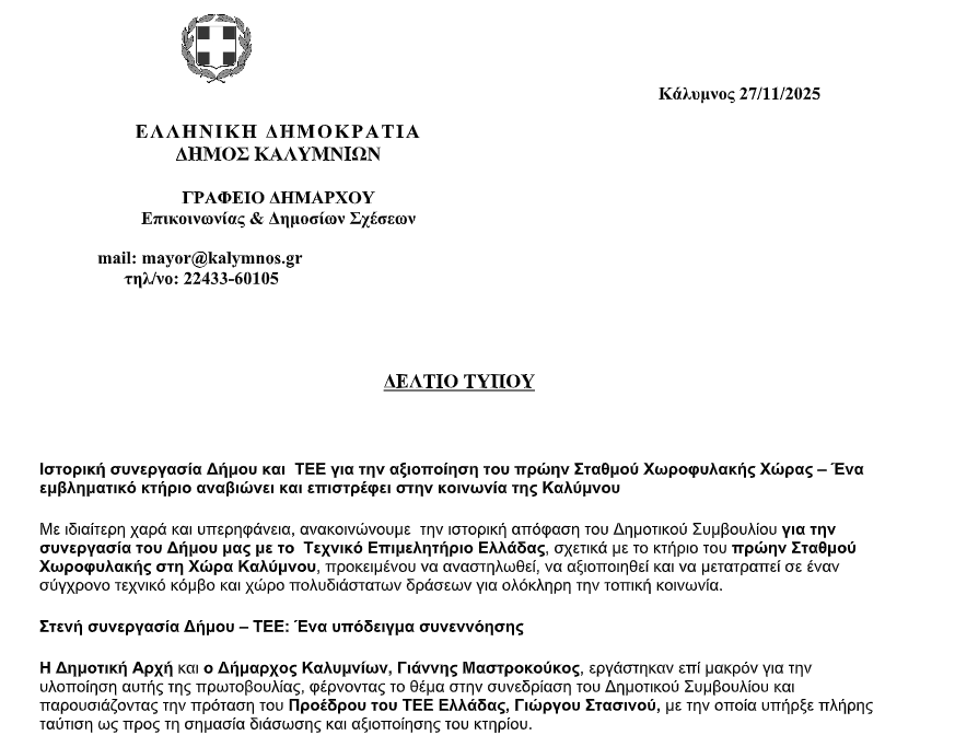 Ο Δήμος Καλυμνίων ανακοινώνει με ιδιαίτερη χαρά την έγκριση της συνεργασίας με το Τεχνικό Επιμελητήριο Ελλάδας για την αναστήλωση και αξιοποίηση του πρώην Σταθμού Χωροφυλακής στη Χώρα Καλύμνου. Πρόκειται για μια ιστορική πρωτοβουλία που θέτει τέλος στην εγκατάλειψη ενός εμβληματικού κτηρίου και ανοίγει τον δρόμο για τη μετατροπή του σε έναν σύγχρονο τεχνικό κόμβο, χώρο δράσεων, εκπαίδευσης και συνεργασίας, επιστρέφοντάς το δυναμικά στην κοινωνία και την ιστορική ταυτότητα της περιοχής.