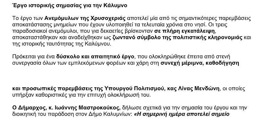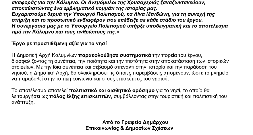 Ολοκληρώθηκε η διοικητική παραλαβή από το Δήμο Καλυμνίων του έργου αποκατάστασης και αναβάθμισης των Ανεμόμυλων της Χρυσοχεριάς