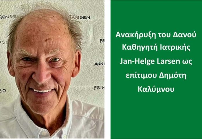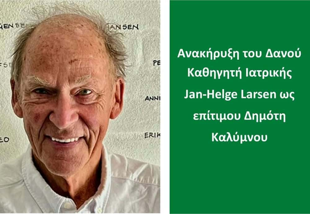 Ο Δήμος Καλυμνίων ανακηρύσσει τον Καθηγητή Ιατρικής Jan Helge Larsen ως Επίτιμο Δημότη Καλυμνίων, αποδίδοντας έτσι τιμή σε έναν άνθρωπο που, με το έργο και την παρουσία του, προβάλλει το νησί διεθνώς και υπηρετεί με ανιδιοτέλεια την επιστημονική γνώση και την εκπαίδευση.