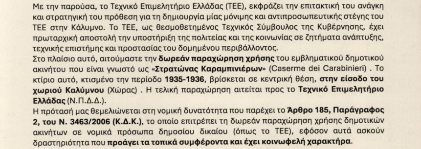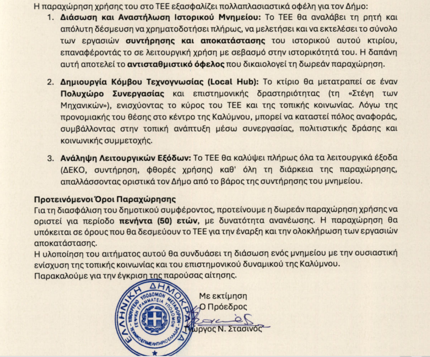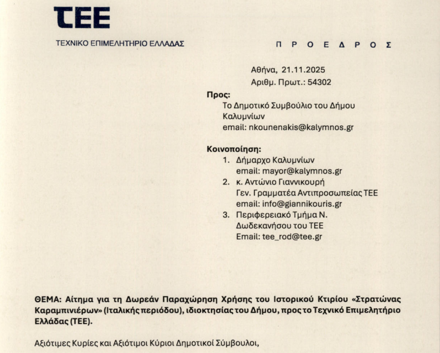 Σε μια ενδιαφέρουσa συνεδρίαση , το Δημοτικό Συμβούλιο Καλυμνίων, την Τρίτη 25 Νοεμβρίου 2025, συζήτησε –εκτός ημερήσιας διάταξης και κατόπιν ομόφωνης αποδοχής– τη δωρεάν παραχώρηση χρήσης του ιστορικού κτιρίου της Παλαιάς Χωροφυλακής/Στρατώνα Καραμπινιέρων προς το Τεχνικό Επιμελητήριο Ελλάδος (ΤΕΕ), Τμήμα Δωδεκανήσου.
