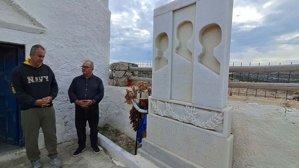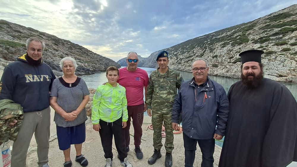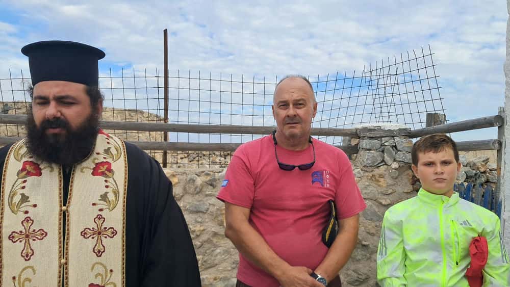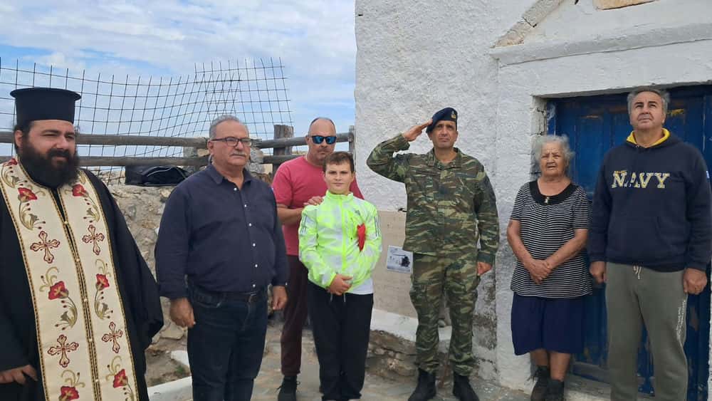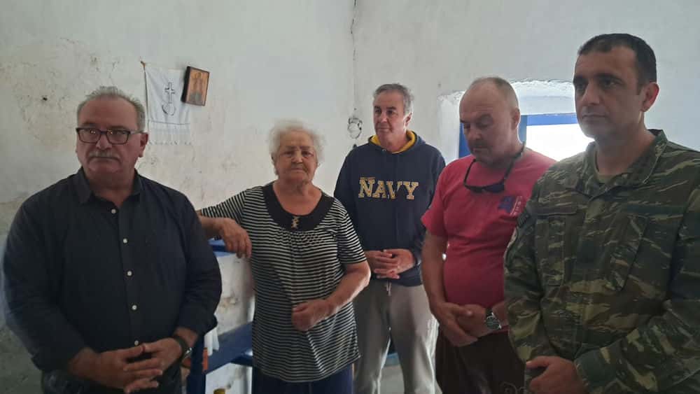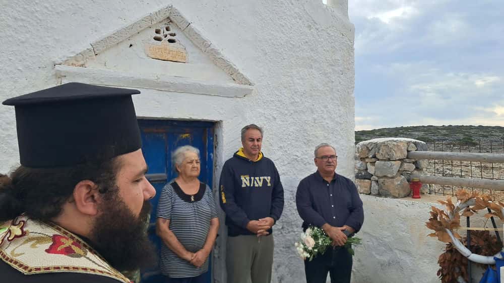 Με την καθοδήγηση της κυράς Ειρήνης, η αποστολή κατευθύνθηκε στο μικρό εκκλησάκι του Αη Γιώργη, όπου ο παπάς Σταύρος τέλεσε επιμνημόσυνη δέηση υπέρ αναπαύσεως των ψυχών όλων όσοι έζησαν και αγωνίστηκαν σε αυτό το μικρό, αλλά γεμάτο ιστορία νησί.