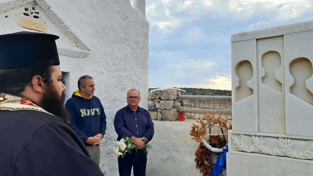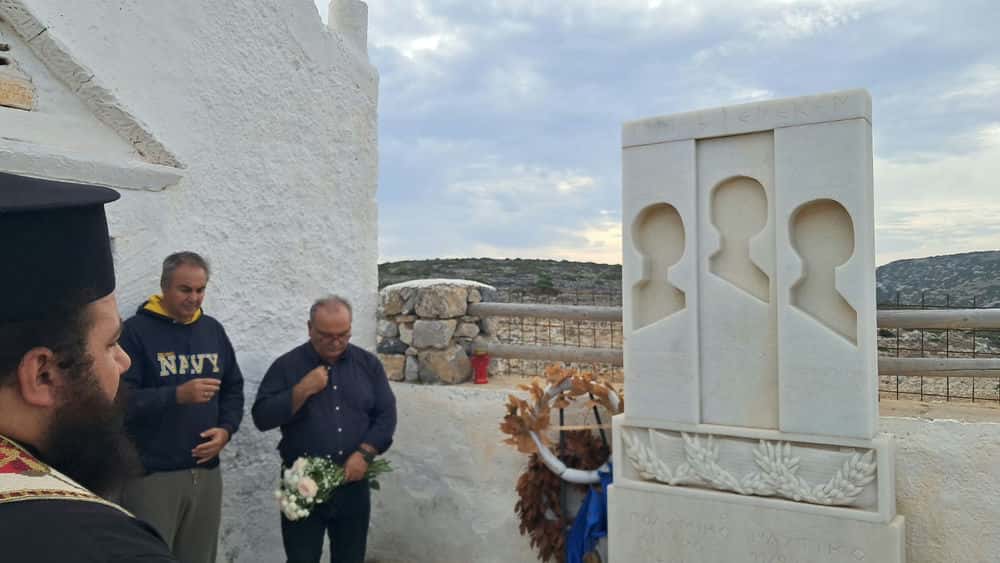 Στη συνέχεια, μπροστά από το λιτό μνημείο των πεσόντων αξιωματικών, τελέστηκε συγκινητικό τρισάγιο, μέσα σε απόλυτη σιωπή και με φόντο το απέραντο γαλάζιο του Αιγαίου. Ήταν μια στιγμή βαθιάς περισυλλογής και εθνικής υπερηφάνειας, που υπενθύμισε τη θυσία ανθρώπων που έπεσαν εκτελώντας το καθήκον τους προς την πατρίδα.