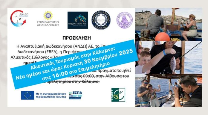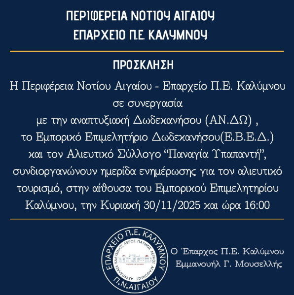 H ενημερωτική ημερίδα για τον Αλιευτικό Τουρισμό που θα πραγματοποιηθεί στην Κάλυμνο και ήταν προγραμματισμένη για το Σάββατο 29 Νοεμβρίου 2025, στην Αίθουσα του Επιμελητηρίου Καλύμνου,λόγω πρόβλεψης δυσμενών καιρικών συνθηκών, θα γινει την Κυριακή 30/11/2025 και ωρα 16:00,