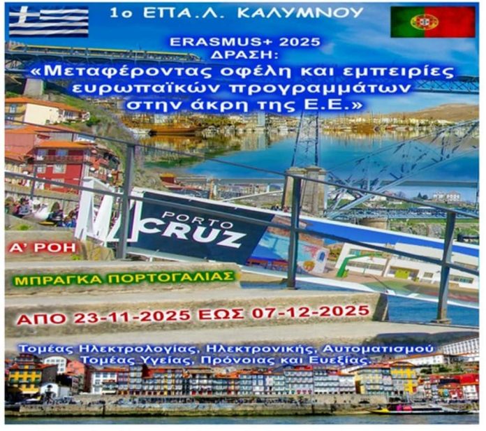 Το 1ο ΕΠΑΛ Καλύμνου συμμετέχει για ακόμα μία χρονιά στο Ευρωπαϊκό Πρόγραμμα Επαγγελματικής Εκπαίδευσης και Κατάρτισης ERASMUS+25 και στα πλαίσια αυτού του Προγράμματος την Κυριακή 23 Νοεμβρίου 2025 αναχώρησαν για την Πορτογαλία και συγκεκριμένα για Μπράγκα .
