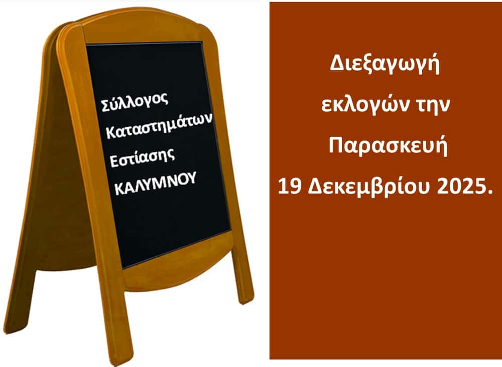 Ο Σύλλογος Καταστημάτων Εστίασης Καλύμνου ανακοινώνει τη διεξαγωγή των επερχόμενων εκλογών την Παρασκευή 19 Δεκεμβρίου 2025. Καλούνται όλα τα μέλη που επιθυμούν να θέσουν υποψηφιότητα να αποστείλουν τη δήλωσή τους έως την Πέμπτη 18 Δεκεμβρίου, συμβάλλοντας ενεργά στη συνέχεια και ενίσχυση της συλλογικής προσπάθειας του κλάδου.