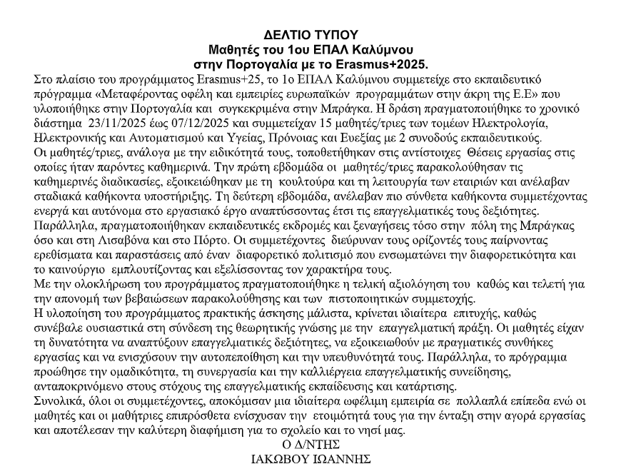 Το 1ο ΕΠΑΛ Καλύμνου συμμετείχε δυναμικά στο πρόγραμμα Erasmus+ 2025, δίνοντας τη δυνατότητα σε μαθητές και μαθήτριες να αποκτήσουν πολύτιμες επαγγελματικές και πολιτισμικές εμπειρίες στο εξωτερικό. Στο πλαίσιο του εκπαιδευτικού προγράμματος «Μεταφέροντας οφέλη και εμπειρίες ευρωπαϊκών προγραμμάτων στην άκρη της Ε.Ε», 15 μαθητές/τριες ταξίδεψαν στην Μπράγκα της Πορτογαλίας, όπου για δύο εβδομάδες συνδύασαν την πρακτική άσκηση σε πραγματικές συνθήκες εργασίας με την επαφή με έναν διαφορετικό πολιτισμό, ενισχύοντας τις δεξιότητες, την αυτοπεποίθηση και την επαγγελματική τους ετοιμότητα.