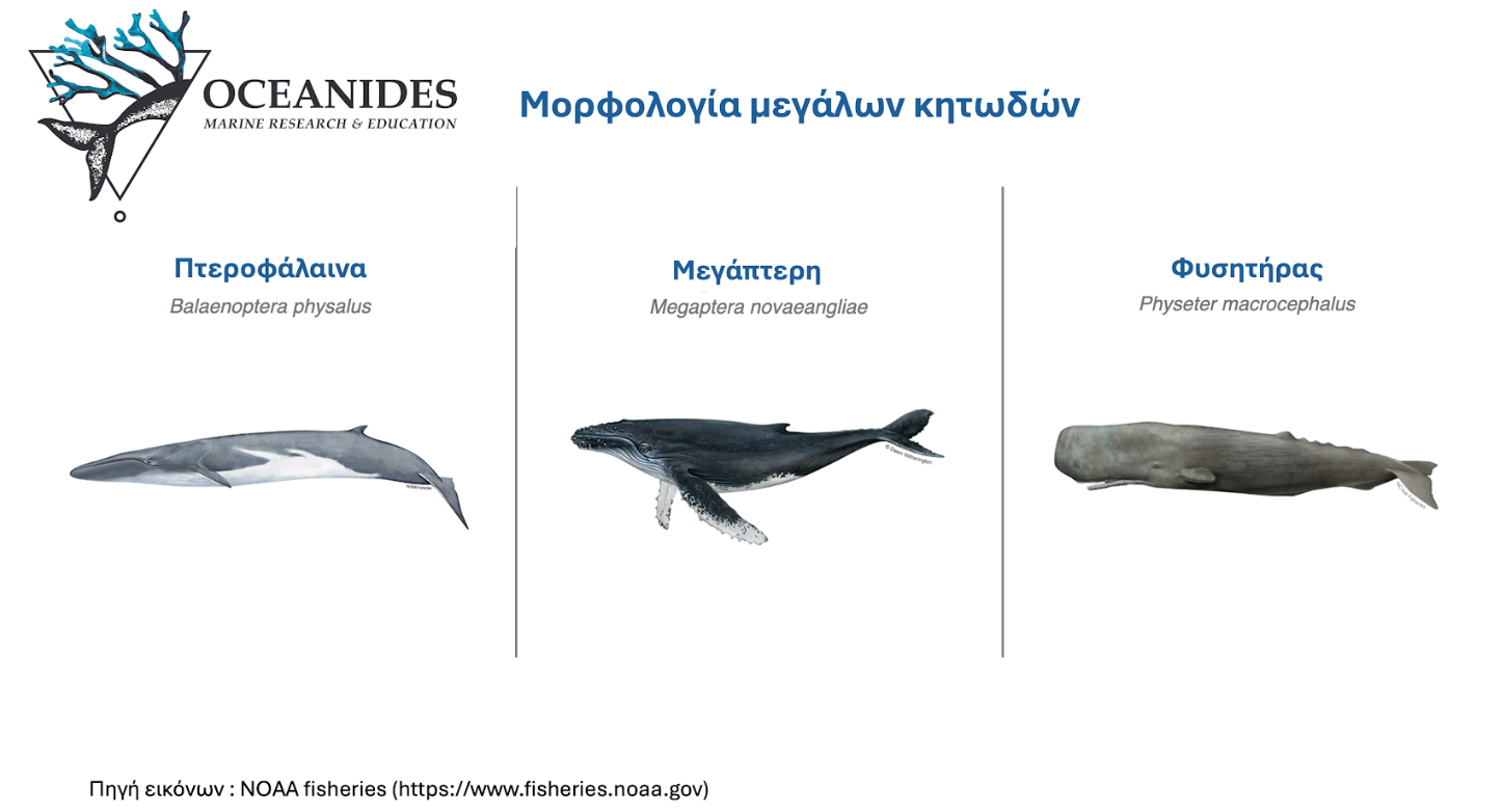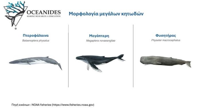 Στην παρακάτω εικόνα βλέπουμε κάποια από τα διαφορετικά είδη μεγάλων  κητωδών που μπορεί να συναντήσουμε στα ελληνικά νερά. Η πτεροφάλαινα  και ο φυσητήρας διατηρούν μόνιμους πληθυσμούς, ενώ η μεγάπτερη  βρίσκεται σπάνια στην περιοχή μας.