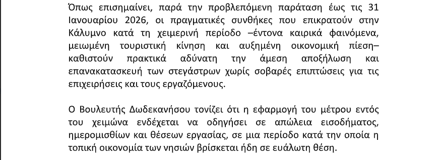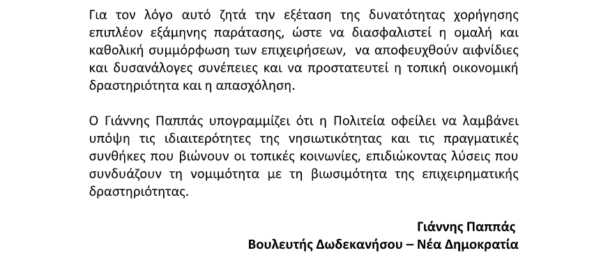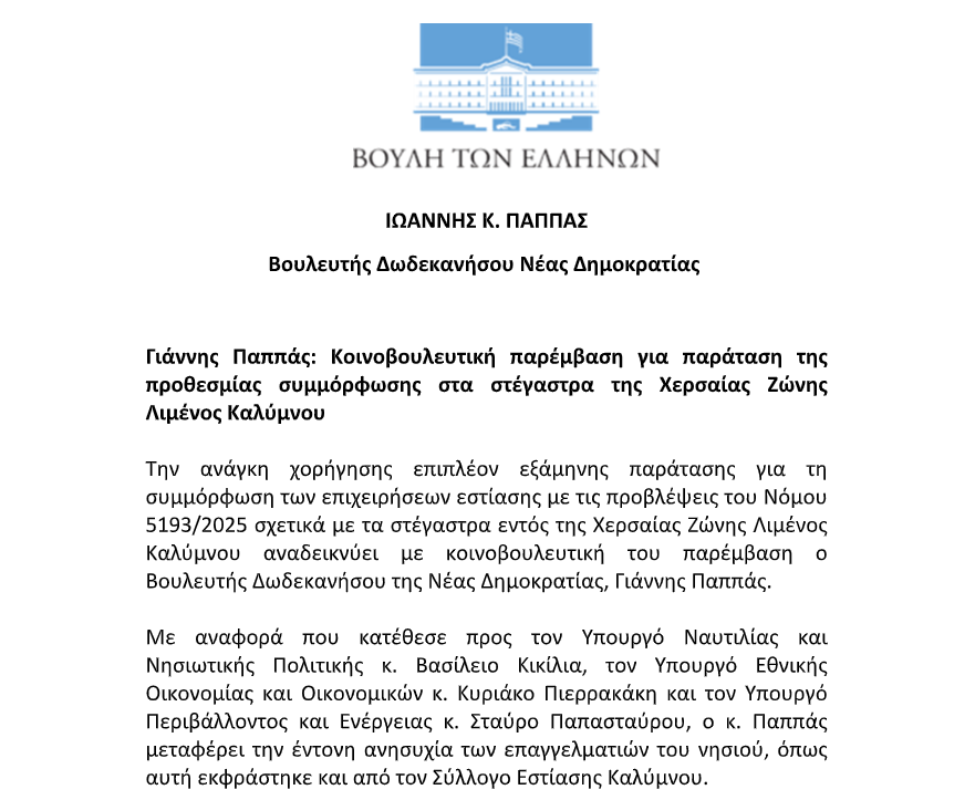 Κοινοβουλευτική παρέμβαση για τη στήριξη επιχειρήσεων εστίασης της Καλύμνου πραγματοποίησε ο Βουλευτής Δωδεκανήσου της Νέας Δημοκρατίας, Γιάννης Παππάς, ζητώντας τη χορήγηση επιπλέον εξάμηνης παράτασης για τη συμμόρφωση με τις διατάξεις του Νόμου 5193/2025 που αφορούν τα στέγαστρα εντός της Χερσαίας Ζώνης Λιμένος. Στόχος της παρέμβασης είναι η αποφυγή σοβαρών οικονομικών και κοινωνικών επιπτώσεων κατά τη χειμερινή περίοδο και η προστασία της τοπικής απασχόλησης και επιχειρηματικότητας.