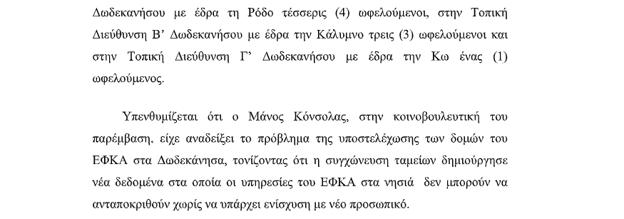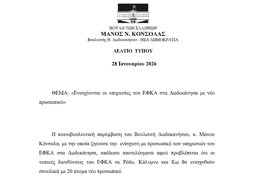Η κοινοβουλευτική παρέμβαση του Βουλευτή Δωδεκανήσου, Μάνου Κόνσολα, με την οποία ζητούσε την ενίσχυση με προσωπικό των υπηρεσιών του ΕΦΚΑ στα Δωδεκάνησα, απέδωσε αποτελέσματα αφού προβλέπεται ότι οι τοπικές διευθύνσεις του ΕΦΚΑ σε Ρόδο, Κάλυμνο και Κω θα ενισχυθούν συνολικά με 20 άτομα νέο προσωπικό.