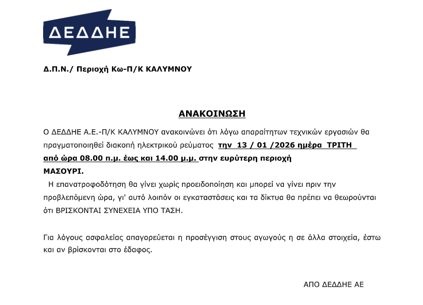 O ΔΕΔΔΗΕ Α.Ε.-Π/Κ ΚΑΛΥΜΝΟΥ ανακοινώνει ότι λόγω απαραίτητων τεχνικών εργασιών θα πραγματοποιηθεί διακοπή ηλεκτρικού ρεύματος την 13 / 01 /2026 ημέρα ΤΡΙΤΗ από ώρα 08.00 π.μ. έως και 14.00 μ.μ. στην ευρύτερη περιοχή ΜΑΣΟΥΡΙ.