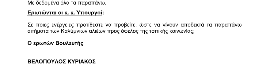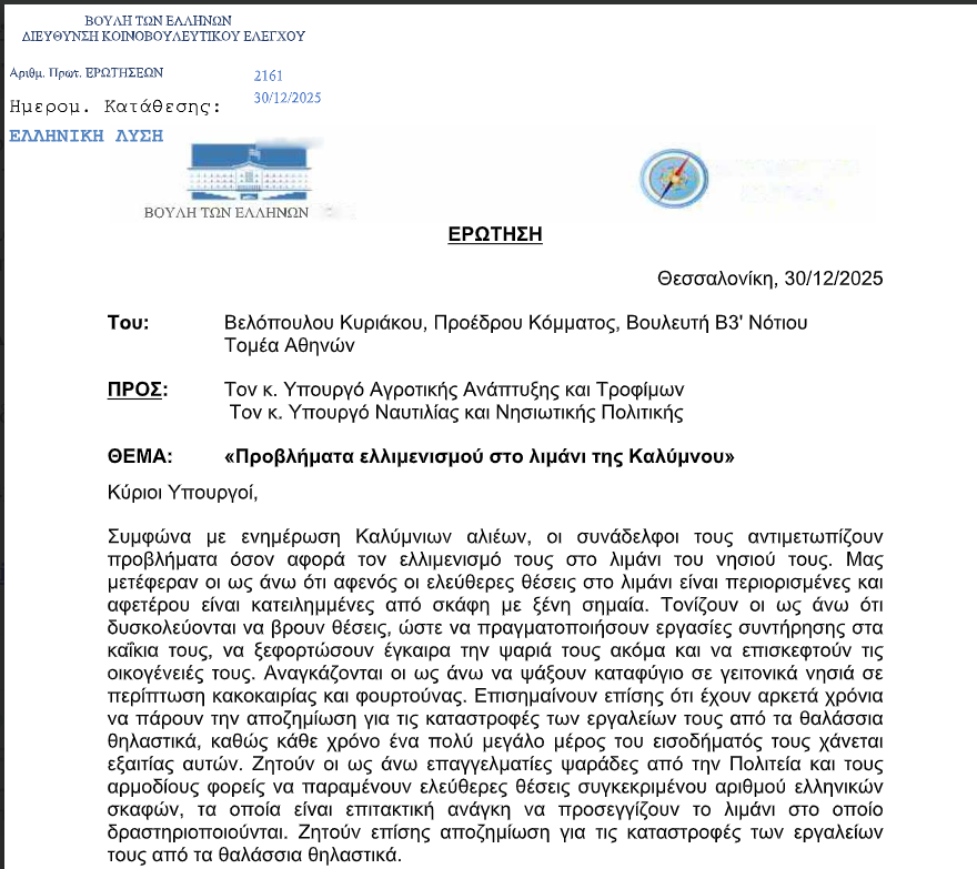 Σοβαρά ζητήματα που αντιμετωπίζουν οι επαγγελματίες αλιείς της Καλύμνου έφερε στη Βουλή ο πρόεδρος κόμματος και βουλευτής Β3’ Νοτίου Τομέα Αθηνών, Κυριάκος Βελόπουλος, με ερώτησή του προς τους Υπουργούς Αγροτικής Ανάπτυξης και Τροφίμων και Ναυτιλίας και Νησιωτικής Πολιτικής, στις 30 Δεκεμβρίου 2025.