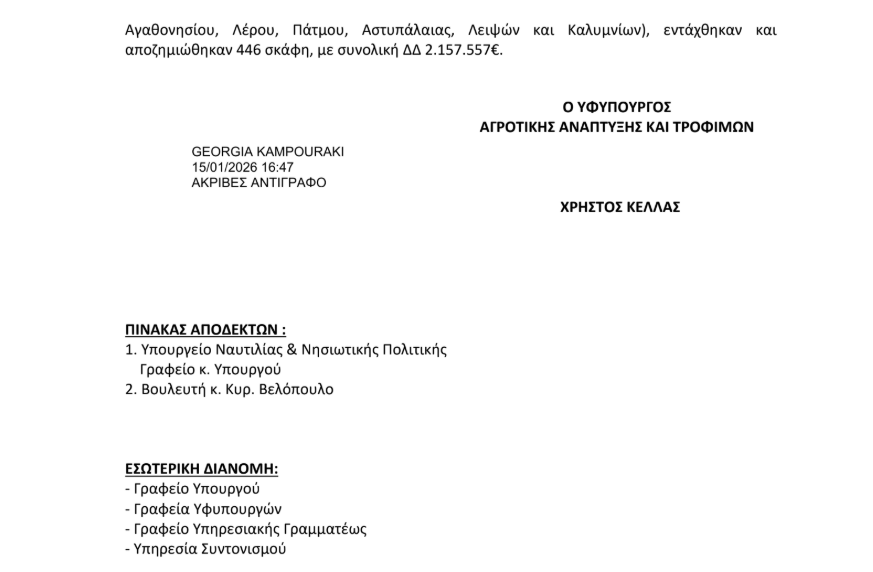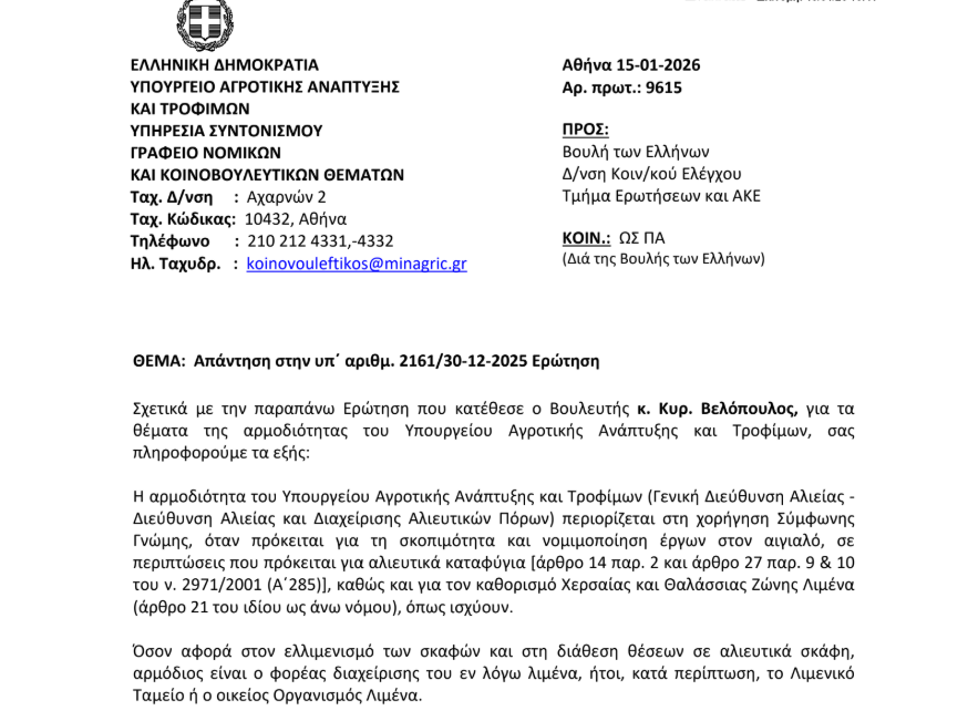 Απαντώντας στην ερώτηση, ο Υφυπουργός Αγροτικής Ανάπτυξης και Τροφίμων, Χρήστος Κέλλας, διευκρίνισε ότι η αρμοδιότητα του Υπουργείου περιορίζεται στη χορήγηση σύμφωνης γνώμης για έργα που αφορούν αλιευτικά καταφύγια και στον καθορισμό χερσαίων και θαλάσσιων ζωνών λιμένα. Όπως ανέφερε, θέματα που αφορούν τον ελλιμενισμό των σκαφών και τη διάθεση θέσεων εμπίπτουν στην ευθύνη του εκάστοτε φορέα διαχείρισης του λιμένα, δηλαδή του Λιμενικού Ταμείου ή του αρμόδιου Οργανισμού Λιμένα.